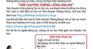 Bạn có thể hiểu rõ hơn về ‘Nói chuyện Thiêng liêng’, mời bạn đọc thêm tại: http://linhthao.net/luutru/2049. Sau khi đã hiểu thế nào là ‘Nói chuyện Thiêng liêng’ rồi và các bạn ước ao muốn tham gia chương trình này, các bạn có thể đăng ký tại link sau: https://forms.gle/aY4svypFoYhpfemB6