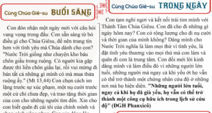 CÙNG CHÚA GIÊSU BUỔI SÁNG Lạy Cha, con nguyện dâng Ngài ngày mới đang đến, xin Cha cho con được cộng tác vào sứ mạng tình yêu của Ngài. Con mở lòng đón nhận Lời Chúa mời gọi con trở nên mảnh đất màu mỡ có thể …