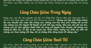 CÙNG CHÚA GIÊSU BUỔI SÁNG Cùng hòa chung với không khí của Mùa xuân, con chào đón ngày Mùng 3 Tết hôm nay với trái tim tràn ngập niềm vui. Hôm nay là ngày đặc biệt để dâng lời cầu nguyện cho việc thánh hóa công ăn việc làm. …