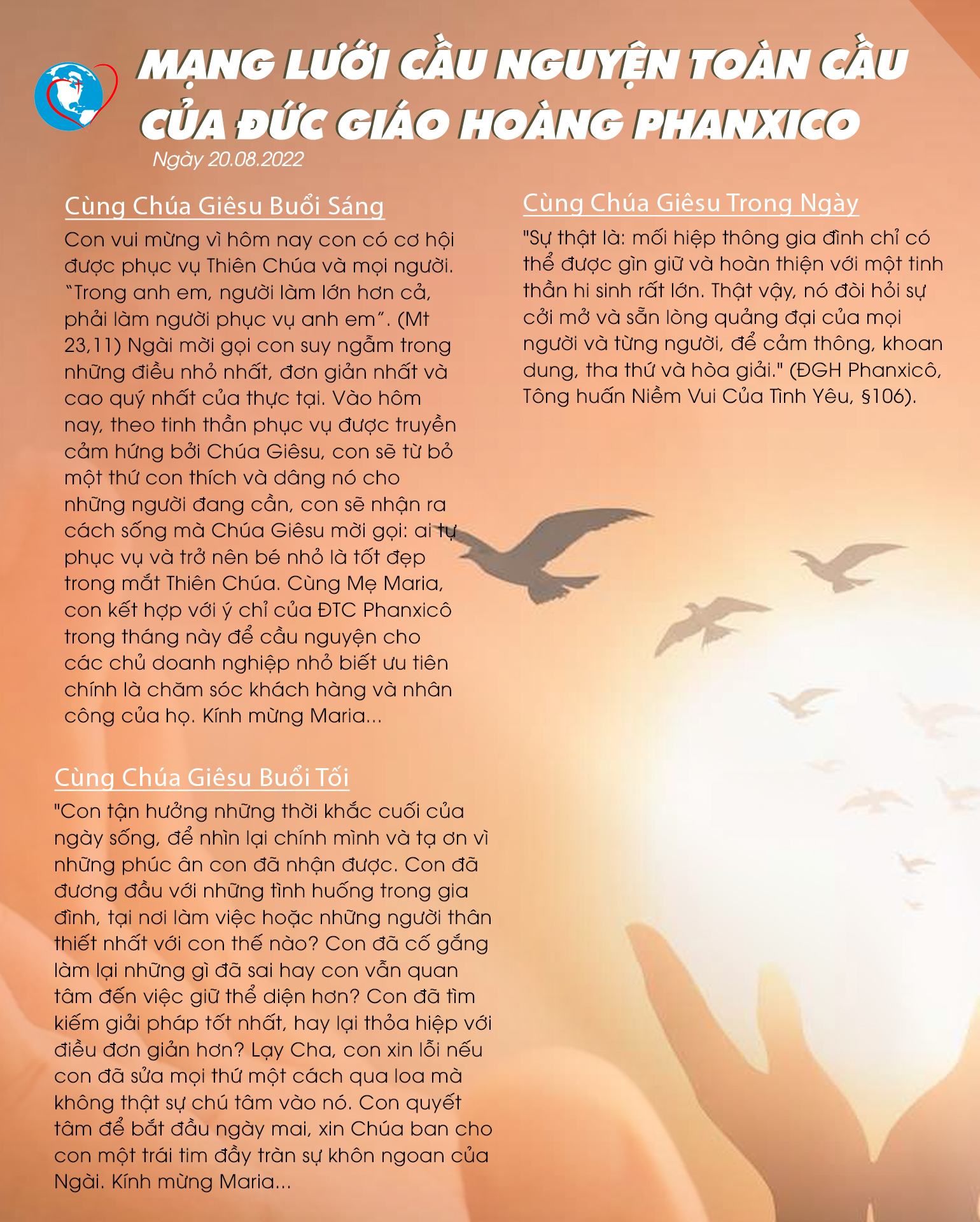 Con vui mừng vì hôm nay con có cơ hội được phục vụ Thiên Chúa và mọi người. “Trong anh em, người làm lớn hơn cả, phải làm người phục vụ anh em”. (Mt 23,11) Ngài mời gọi con suy ngẫm trong những điều nhỏ nhất, đơn giản nhất và cao quý nhất của thực tại. Vào hôm nay, theo tinh thần phục vụ được truyền cảm hứng bởi Chúa Giêsu, con sẽ từ bỏ một thứ con thích và dâng nó cho những người đang cần, con sẽ nhận ra cách sống mà Chúa Giêsu mời gọi: ai tự phục vụ và trở nên bé nhỏ là tốt đẹp trong mắt Thiên Chúa. Cùng Mẹ Maria, con kết hợp với ý chỉ của ĐTC Phanxicô trong tháng này để cầu nguyện cho các chủ doanh nghiệp nhỏ biết ưu tiên chính là chăm sóc khách hàng và nhân công của họ. Kính mừng Maria…