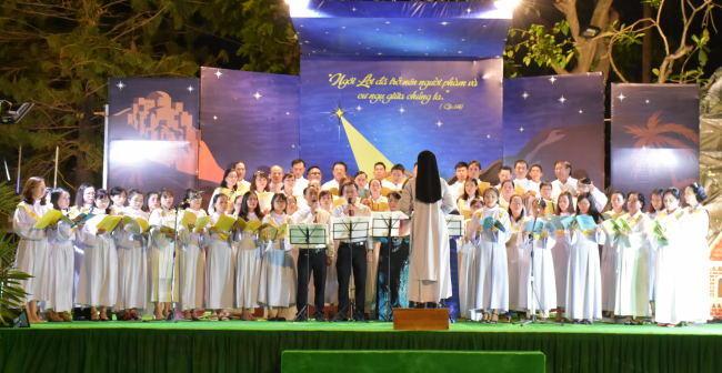 Ngay từ chiều, những ảnh hưởng ban đầu của cơn bão Tembin xa bờ đã gây nên gió lớn trên địa bàn Giáo xứ, nhưng vẫn không ngăn được bước chân của anh chị em giáo dân và cả những người không cùng tôn giáo đến tham dự buổi diễn nguyện với chủ đề “Đêm an bình”, chính thức khai mạc lúc 19h00.