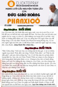 Lạy Cha trên trời, khi khởi đầu một ngày mới, con xin tạ ơn Cha vì cơ hội để con có thể trở nên một người tốt hơn. Xin ban cho con trở nên con người của hy vọng và chân lý, nuôi dưỡng con trong tất cả sự thật, việc lành và những điều thiện mỹ. Con xin dâng lên Cha ngày hôm nay để hiệp cùng ý chỉ của Đức Thánh Cha Phanxicô trong tháng này, là xin cho ngôn ngữ của tình yêu và đối thoại luôn vượt trội ngôn ngữ của xung đột, mâu thuẫn. Sáng Danh Đức Chúa Cha…