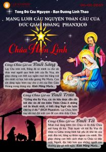 Lạy Cha trên trời, Đấng đã tỏ mình ra cho tất thảy mọi người qua hình ảnh của Ba Vua, xin giúp chúng con biết suy ngẫm mọi thứ bằng trái tim mình và học hỏi mẫu gương Mẹ Maria. Con xin dâng ngày hôm nay cho ý chỉ của Đức Giáo Hoàng trong tháng này. Kính Mừng Maria…