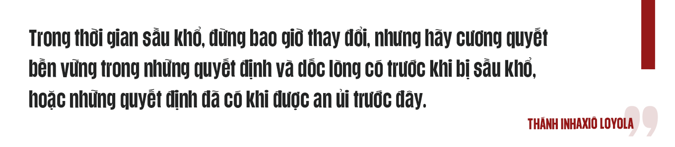Thánh I-nhã dạy chúng ta một nguyên tắc vàng: trong khi bối rối [2], khi có xung đột trong nội tâm, thì hãy nhẫn nại, hãy làm điều ngược lại với những xáo trộn đang xảy đến trong tâm hồn, và nhất là đừng bao giờ thay đổi điều mà mình đã cam kết trước đó. Nói một cách khác, trong đời sống đức tin, khi gặp những bối rối và nghi ngờ, chúng ta thường bị cám dỗ bỏ cuộc và thoái lui… những lúc ấy ta nên làm ngược lại, là giữ cam kết và sống trung thành với điều mình đã hứa trước đó. Đợi khi nào tâm hồn bình an trở lại, chúng ta sẽ nhận định xem Thiên Chúa đang muốn dẫn tôi đi đâu.