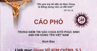 Anh em Dòng Tên Việt Nam Tỉnh Dòng Phanxicô Xaviê xin kính báo: BÀ CỐ MARIA LÊ THỊ KIM SA Thân mẫu thầy JB. Hoàng Lê Công Đức, SJ đã được Chúa gọi về ngày 08/05/2023, hưởng thọ 71 tuổi. Thánh Lễ An Táng sẽ được cử hành lúc 8h00, …