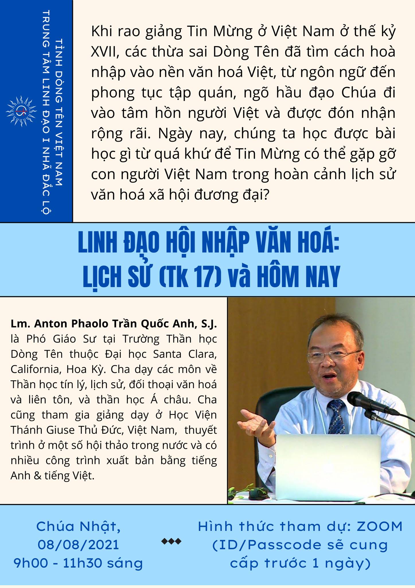 Đại diện Tỉnh Dòng Tên Việt Nam, Trung Tâm Linh Đạo I Nhã Đắc Lộ (CIS) tiếp tục tổ chức buổi chuyên đề trực tuyến: LINH ĐẠO HỘI NHẬP VĂN HOÁ: LỊCH SỬ (Tk 17) và HÔM NAY trong Năm Thánh I Nhã lúc 9h00 – 11h30 (giờ VN), sáng ngày Chúa Nhật, 08/08/2021.