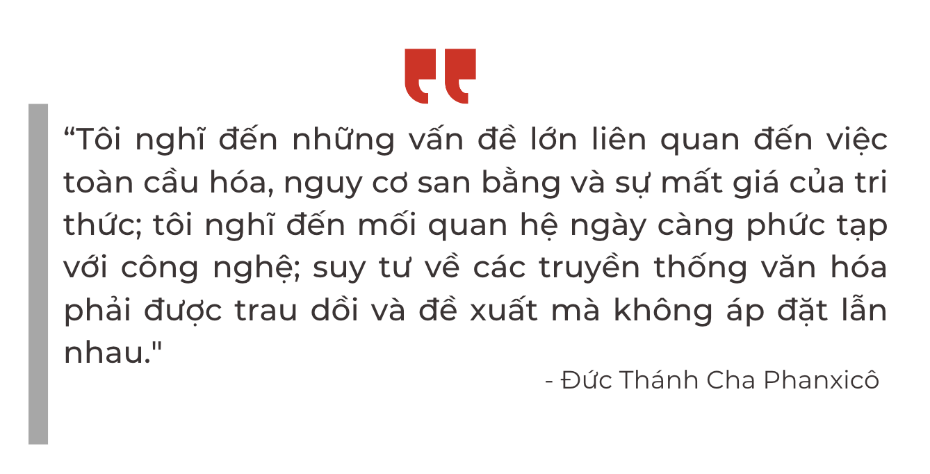 “Tôi nghĩ đến những vấn đề lớn liên quan đến việc toàn cầu hóa, nguy cơ san bằng và sự mất giá của tri thức; tôi nghĩ đến mối quan hệ ngày càng phức tạp với công nghệ; suy tư về các truyền thống văn hóa phải được trau dồi và đề xuất mà không áp đặt lẫn nhau.”