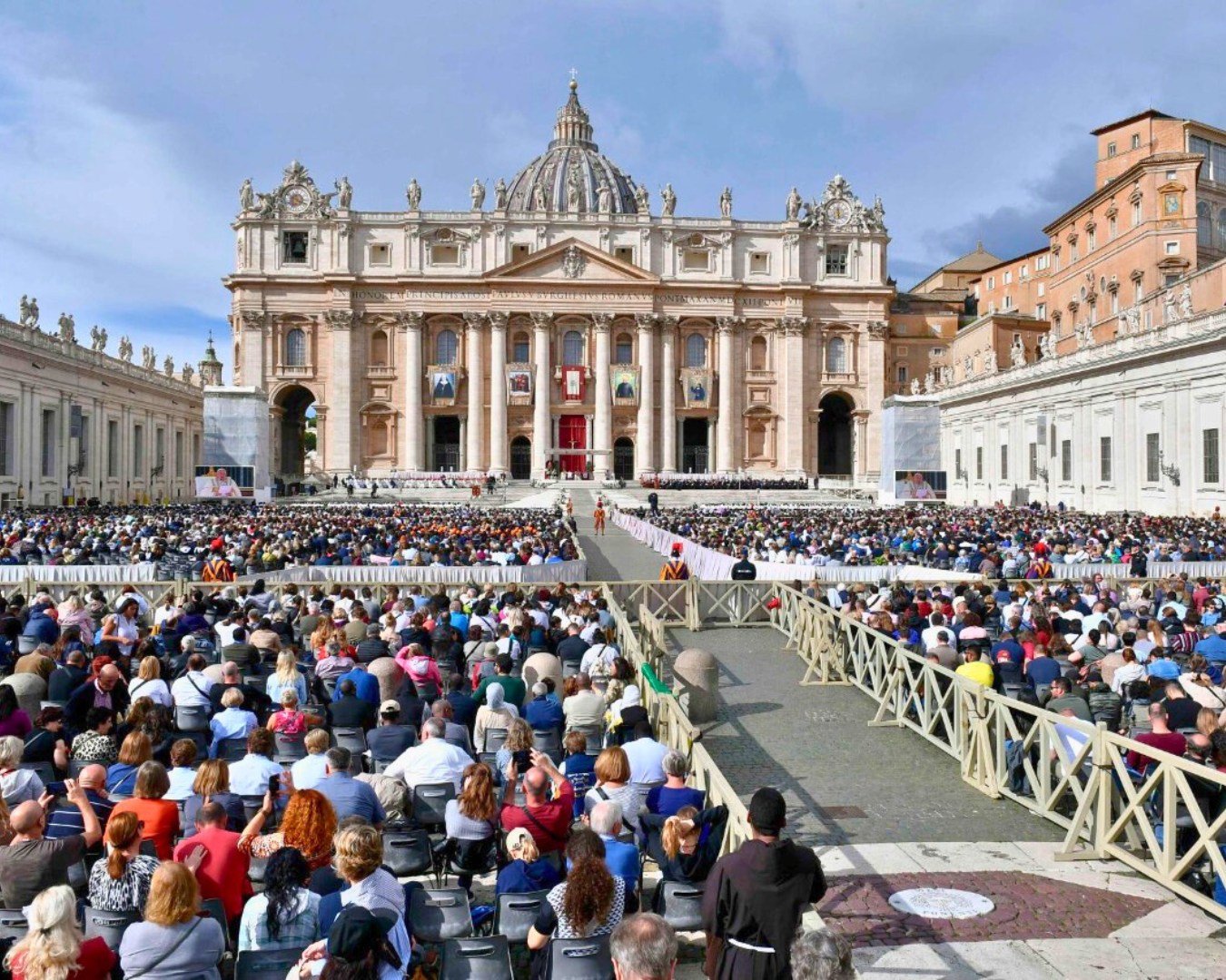 Vào cuối Thánh Lễ, trước khi đọc Kinh Truyền Tin và ban phép lành, Đức Thánh Cha nhắc rằng hôm nay chúng ta mừng Ngày Thế giới Truyền giáo, với chủ đề “Hãy đi mời mọi người đến dự tiệc” (xem Mt 22:9), nhắc nhở chúng ta rằng lời loan báo truyền giáo là mang đến cho mọi người lời mời tham dự một cuộc gặp gỡ lễ hội với Chúa, Đấng yêu thương chúng ta và muốn chúng ta chia sẻ niềm vui của Người. Như các vị Thánh mới dạy chúng ta: “Mỗi Kitô hữu được kêu gọi tham gia vào sứ mạng phổ quát này với chứng tá Tin Mừng của chính mình trong mọi môi trường” (Sứ điệp Ngày Truyền giáo Thế giới lần thứ 98, ngày 25 tháng 1 năm 2024). Chúng ta, bằng lời cầu nguyện và sự giúp đỡ của mình, hỗ trợ tất cả các nhà truyền giáo, những người thường hy sinh rất nhiều để mang Tin Mừng đến mọi miền trên trái đất.