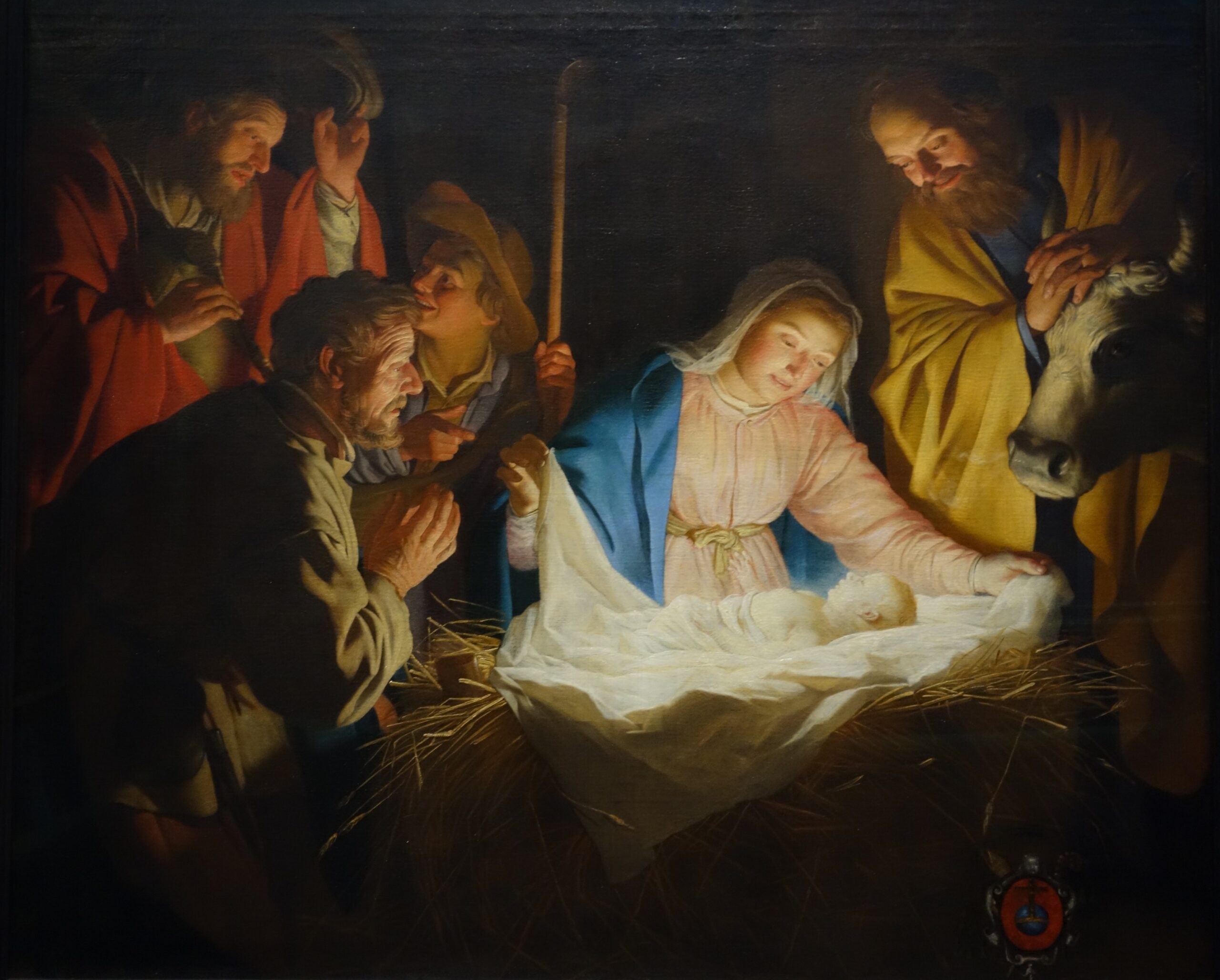 Tiếp đến chúng ta tự hỏi: từ đâu mà ánh sáng trong bức tranh được chiếu toả ra? Bình thường trong các bức tranh Giáng Sinh thường hay có một các ngôi sao trên trời hay ngôi sao chổi toả ánh sáng xuống, hay ánh sáng toả ra từ một cây đèn dầu được treo ở trong phòng. Nhưng trong bức tranh này, danh họa Honthorst đã không để cho những nguồn sáng đó xuất hiện. Lạ thay!