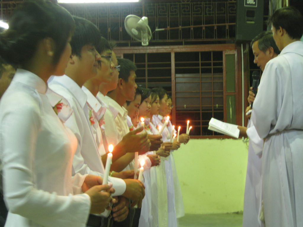 Sau bài giảng là phần ban bí tích Khai tâm Ki-tô giáo cho anh chị em dự tòng. Anh chị em dự tòng cùng cộng đoàn tuyên hứa từ bỏ ma quỷ và tuyên xưng niềm tin vào Thiên Chúa. Lần lượt từng anh chị dự tòng lãnh nhận Bí tích Rửa tội và Bí Tích Thêm sức. Từ đây, những anh chị em tân tòng này trở nên con cái Thiên Chúa, trở nên anh chị em trong cùng một Hội Thánh Chúa Ki-tô. Kết thúc nghi thức Rửa tội và Thêm sức, cộng đoàn dân Chúa vỗ tay hân hoan chúc mừng và đón nhận anh chị em tân tòng.