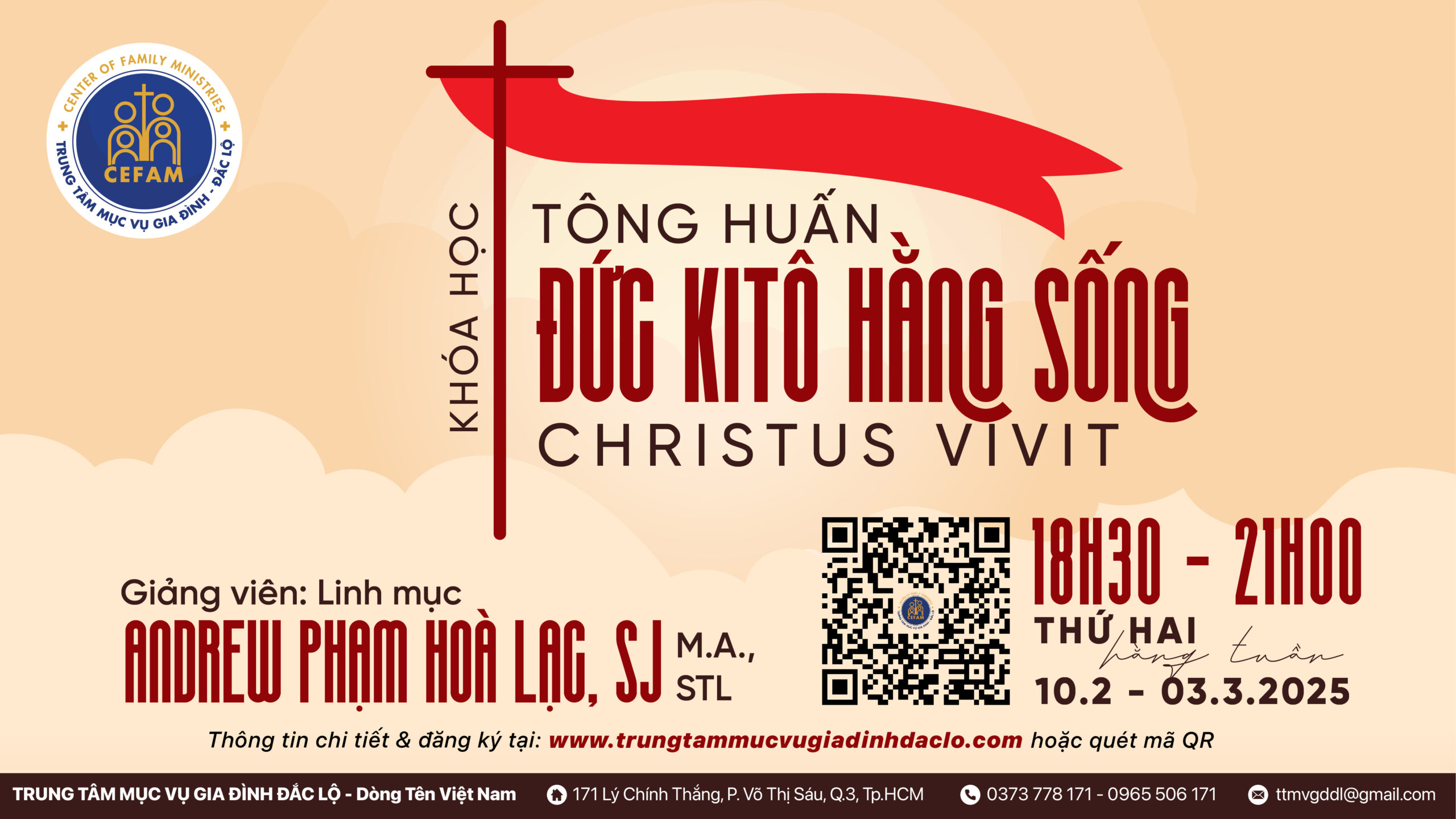 - Địa điểm: Trung Tâm Mục Vụ Gia Đình Đắc Lộ, 171 Lý Chính Thắng, P. Võ Thị Sáu, Q.3, Tp. HCM