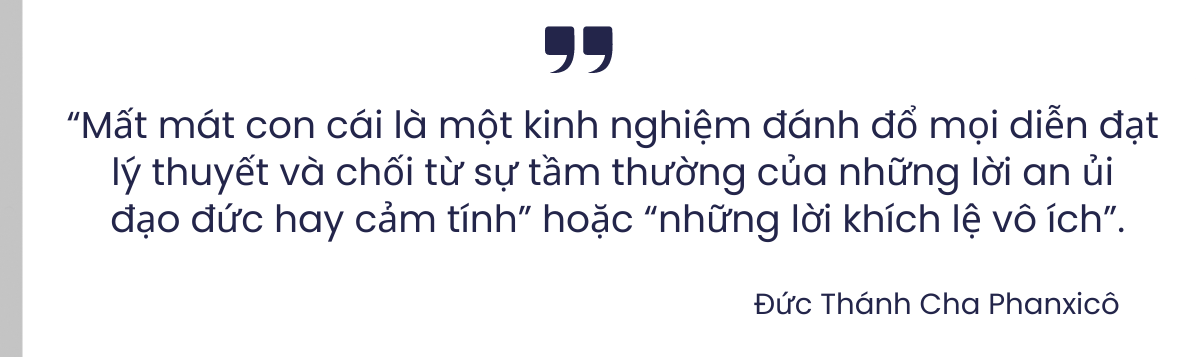 Nhận ra rằng những câu nói đạo đức mà các tín hữu thường dùng để an ủi những cha mẹ đang buồn sầu sẽ không giúp ích gì và thậm chí có thể khiến họ thêm đau khổ, Đức Thánh Cha khuyên rằng cách đáp lại tốt nhất là “noi theo cảm xúc và lòng xót thương của Chúa Giê-su trước nỗi đau,” không cố gắng giảm thiểu nỗi đau, nhưng cùng chia sẻ.