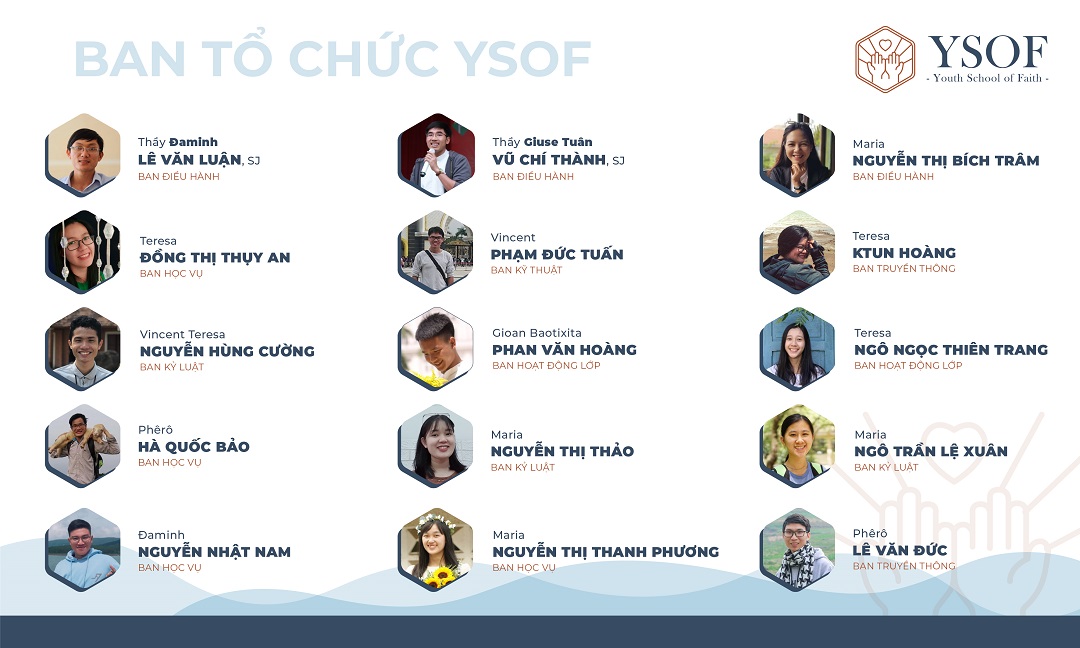 Sau đó, YSOF giới thiệu về quý Giảng Viên của chương trình. Thật hạnh phúc khi YSOF có được đội ngũ Giảng Viên là quý linh mục, tu sĩ dòng Tên, và các vị khách mời bao gồm cả giáo dân có chuyên môn. Để YSOF được vận hành tốt, nhiều bạn trẻ đã sẵn lòng cộng tác vào Ban Tổ Chức YSOF.