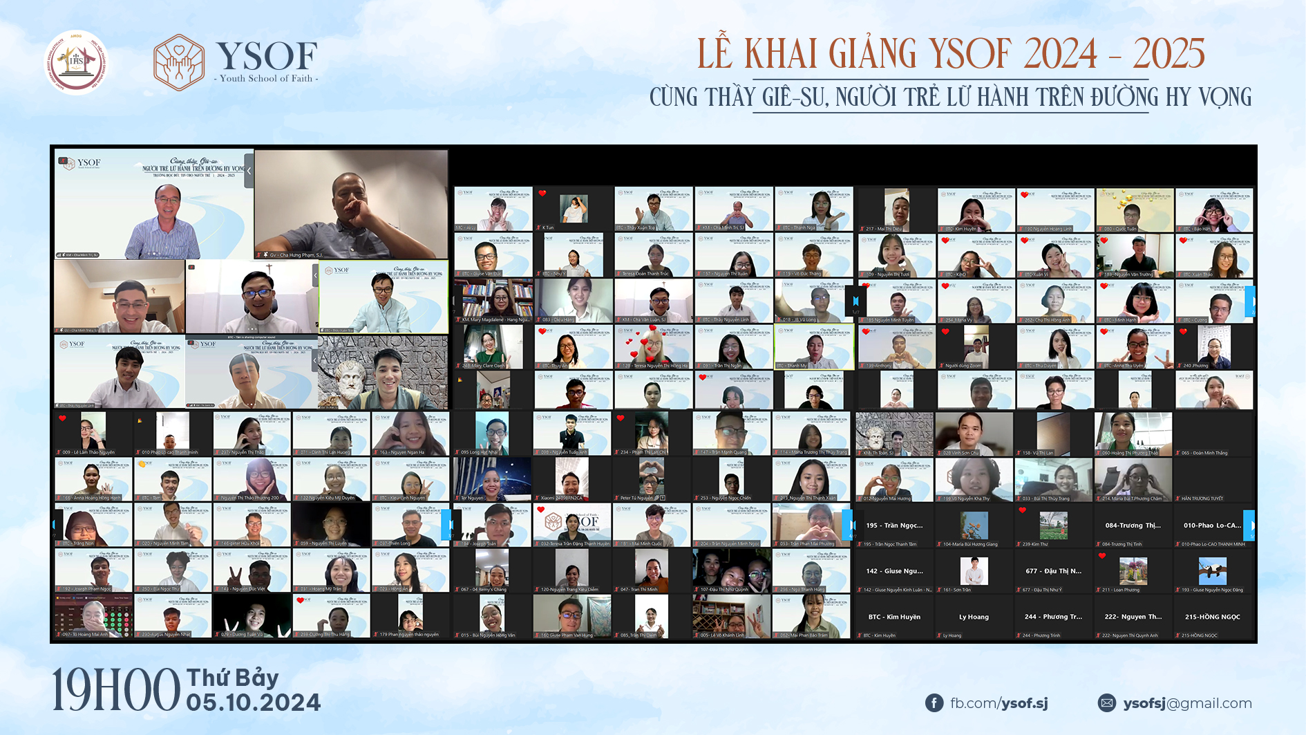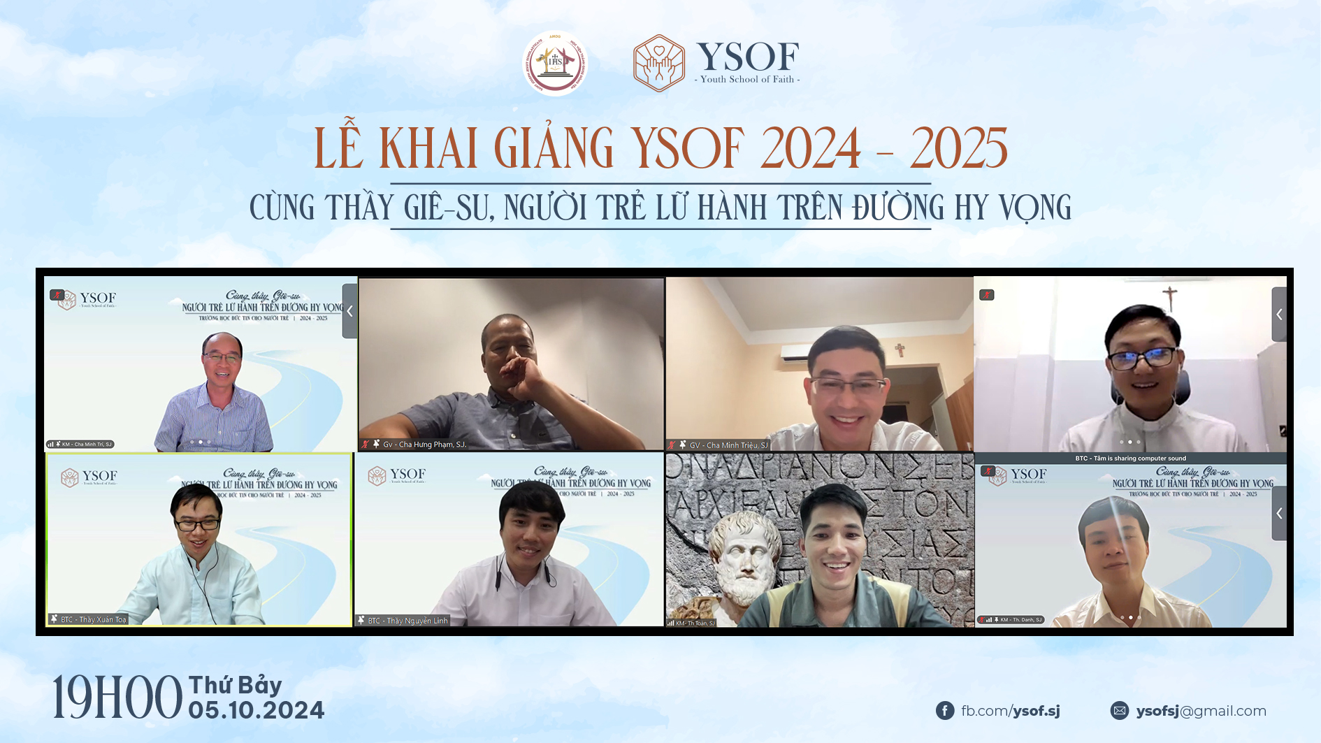 Trong hân hoan, Trường học Đức tin cho Người trẻ – YSOF mùa IV với chủ đề “Cùng Thầy Giêsu, người trẻ lữ hành trên đường hy vọng” đã chính thức khai giảng vào ngày 05/10/2024 vừa qua. Lễ khai giảng vinh dự có sự hiện diện của Cha Barnaba Vũ Minh Trí, SJ – Viện Trưởng Học viên Thánh Giuse – Dòng Tên Việt Nam; Ban Cố vấn; quý giảng viên và khách mời; quý thầy, thành viên Ban Tổ Chức YSOF và toàn thể học viên mùa IV.