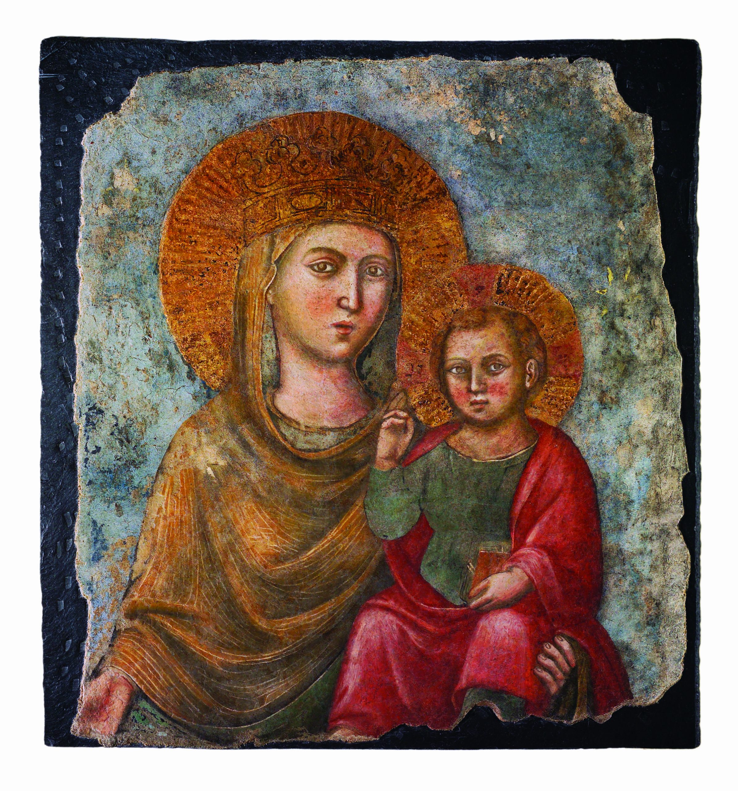Chiêm ngắm Mẹ Maria, chúng ta thấy Mẹ được hoạ sĩ “mặc” vào màu vàng của vinh quang và cao thượng. Từ triều thiên toả ra quanh đầu mẹ đến vương miện của Mẹ, và cả khăn choàng đầu cũng như áo choàng Mẹ đều mang màu vàng sang trọng và cao thượng. Khăn choàng đầu bên trong và áo trong của Mẹ có màu xanh nhạt tương hợp với màu của nền bức tranh làm cho màu vàng ở nơi Mẹ được “tô đậm” hơn nữa.