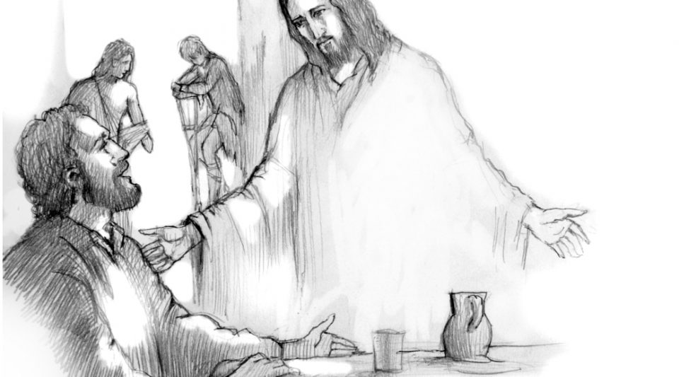 Hạ mình xuống khi được chủ mời dự tiệc: theo thói thường, người ta thích đi tìm cỗ nhất. Đức Giêsu dạy ngược lại: “hãy ngồi vào chỗ cuối” (Lc 14,10), để khi chủ nhà đến và nhận ra thì mời anh lên trên, lúc đó anh sẽ được vinh dự. Trái lại chủ nhà sẽ mời anh xuống dưới và anh sẽ phải xấu hổ! – Hạ mình xuống khi đãi khách dự tiệc: cũng theo thói thường, khi mời khách dự tiệc, người ta thích mời bạn bè, anh em, bà con, thân thuộc, giàu có để được họ đáp lại. Đức Giêsu dạy ngược lại: “hãy mời những kẻ nghèo khó, tàn tật, què quặt, đui mù”(Lc 14,13), vì họ không có gì đáp lại.