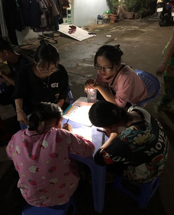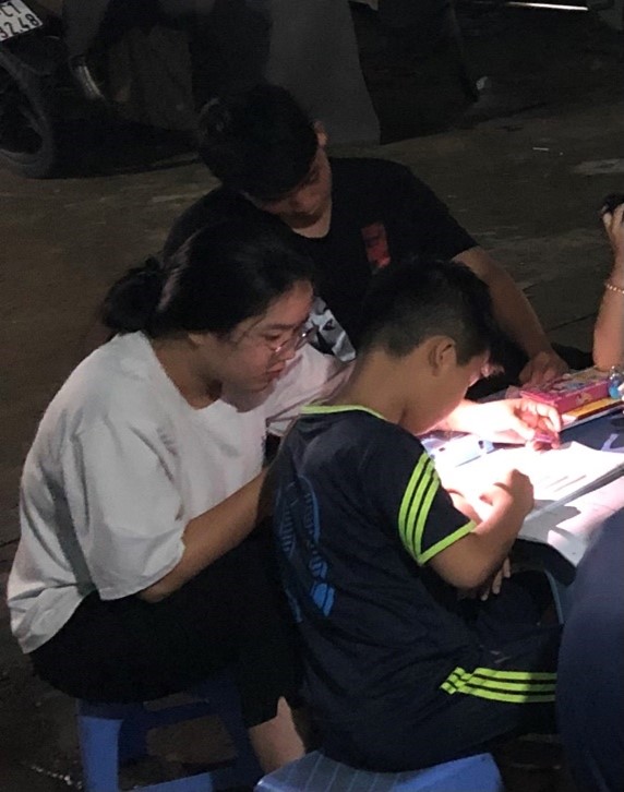 Trớ trêu thay, ánh sáng của tri thức và ngọn lửa nhiệt thành trong lòng các bạn sinh viên thiện nguyện dẫu có mạnh mẽ và trào tràn đến mấy cũng không thể thắp sáng thay ánh mặt trời. Khi thấy các em học sinh cứ phải cúi rạp người xuống bàn hầu có thể nhìn thấy lờ mờ những con chữ nhỏ li ti trên từng trang giấy, vì trời thì tối mà ánh sáng thì nhá nhem. Các bạn sinh viên chẳng ai bảo ai, mỗi người đều rút điện thoại ra, mở ứng dụng đèn pin lên để soi dọi cho các em nhỏ học bài. Một hình ảnh thật đẹp và cảm động lắm thay!