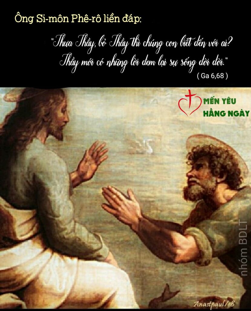 Vậy Đức Giê-su hỏi Nhóm Mười Hai: “Cả anh em nữa, anh em cũng muốn bỏ đi hay sao?” Ông Si-môn Phê-rô liền đáp: “Thưa Thầy, bỏ Thầy thì chúng con biết đến với ai? Thầy mới có những lời đem lại sự sống đời đời. Phần chúng con, chúng con đã tin và nhận biết rằng chính Thầy là Đấng Thánh của Thiên Chúa.”