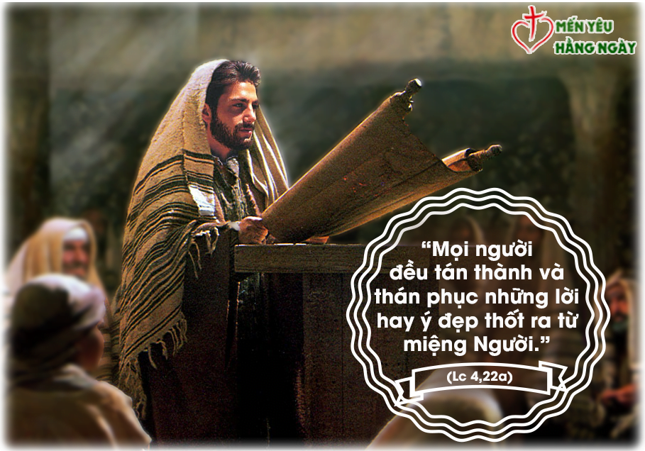 Đức Giê-su cuộn sách lại, trả cho người giúp việc hội đường, rồi ngồi xuống. Ai nấy trong hội đường đều chăm chú nhìn Người. Người bắt đầu nói với họ: “Hôm nay đã ứng nghiệm lời Kinh Thánh quý vị vừa nghe.” Mọi người đều tán thành và thán phục những lời hay ý đẹp thốt ra từ miệng Người.