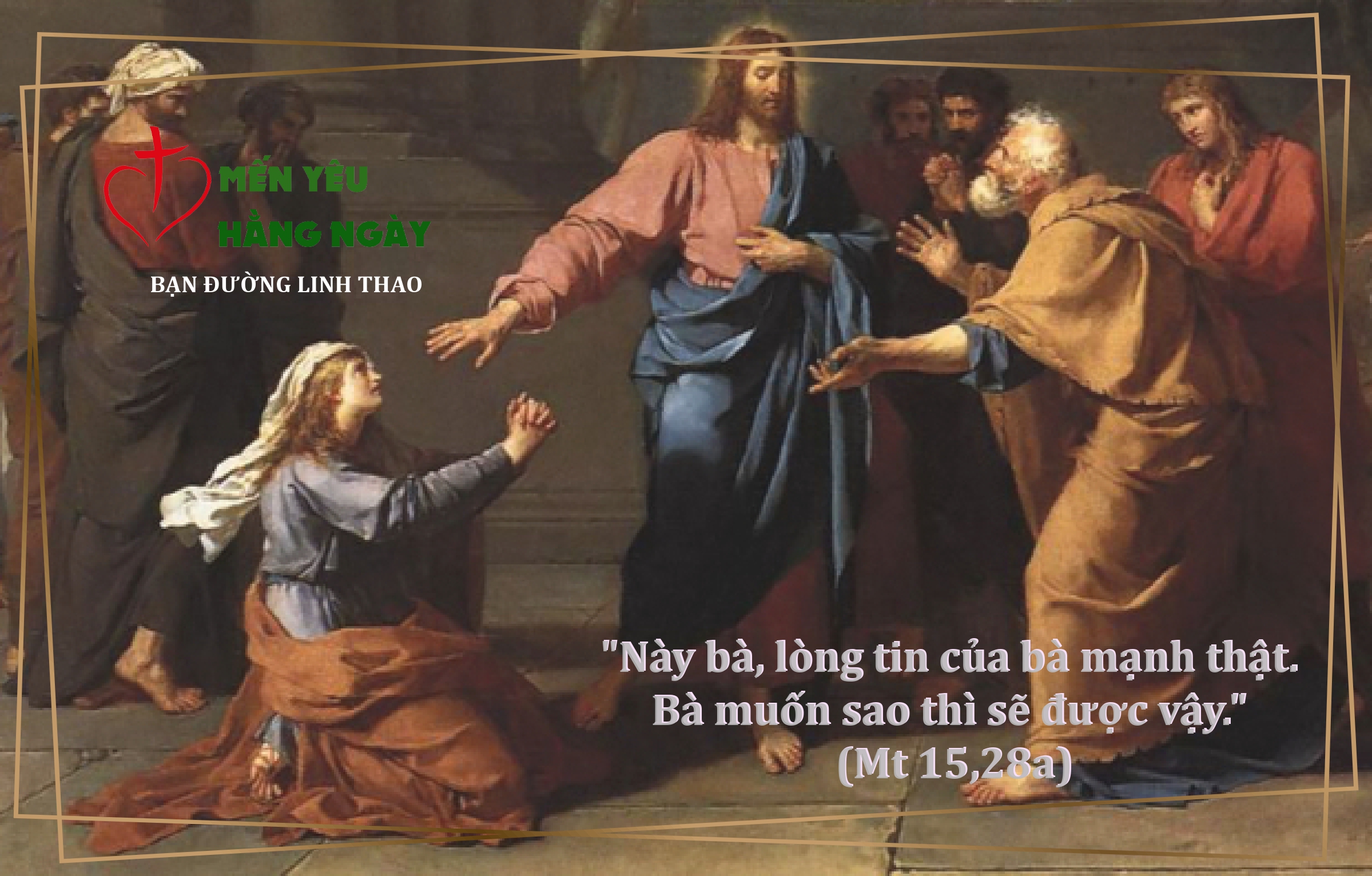 Các môn đệ lại gần xin với Người rằng: “Xin Thầy bảo bà ấy về đi, vì bà ấy cứ theo sau chúng ta mà kêu mãi!” Người đáp: “Thầy chỉ được sai đến với những con chiên lạc của nhà Ít-ra-en mà thôi.” Bà ấy đến bái lạy mà thưa Người rằng: “Lạy Ngài, xin cứu giúp tôi!” Người đáp: “Không nên lấy bánh dành cho con cái mà ném cho lũ chó con.” Bà ấy nói: “Thưa Ngài, đúng thế, nhưng mà lũ chó con cũng được ăn những mảnh vụn trên bàn chủ rơi xuống.” Bấy giờ Đức Giê-su đáp: “Này bà, lòng tin của bà mạnh thật. Bà muốn sao thì sẽ được vậy.” Từ giờ đó, con gái bà được khỏi.