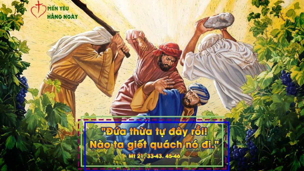 Các ông hãy nghe một dụ ngôn khác: “Có gia chủ kia trồng được một vườn nho; chung quanh vườn, ông rào giậu; trong vườn, ông khoét bồn đạp nho, và xây một tháp canh. Ông cho tá điền canh tác, rồi trẩy đi xa. Gần đến mùa hái nho, ông sai đầy tớ đến gặp các tá điền để thu hoa lợi. Bọn tá điền bắt các đầy tớ ông: chúng đánh người này, giết người kia, ném đá người nọ. Ông lại sai một số đầy tớ khác đông hơn trước: nhưng bọn tá điền cũng xử với họ y như vậy. Sau cùng, ông sai chính con trai mình đến gặp chúng, vì nghĩ rằng: “Chúng sẽ nể con ta.” Nhưng bọn tá điền vừa thấy người con, thì bảo nhau: “Đứa thừa tự đây rồi! Nào ta giết quách nó đi, và đoạt lấy gia tài nó!” Thế là chúng bắt lấy cậu, quăng ra bên ngoài vườn nho, và giết đi. Vậy xin hỏi: Khi ông chủ vườn nho đến, ông sẽ làm gì bọn tá điền kia?” Họ đáp: “Ác giả ác báo, ông sẽ tru diệt bọn chúng, và cho các tá điền khác canh tác vườn nho, để cứ đúng mùa, họ nộp hoa lợi cho ông.” Đức Giê-su bảo họ: “Các ông chưa bao giờ đọc câu này trong Kinh Thánh sao? Tảng đá thợ xây nhà loại bỏ lại trở nên đá tảng góc tường. Đó chính là công trình của Chúa, công trình kỳ diệu trước mắt chúng ta.