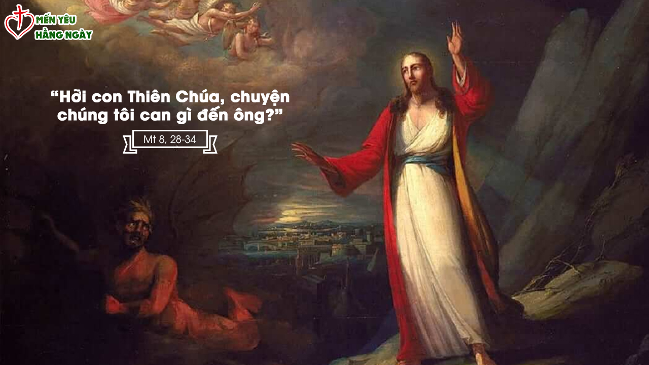 Khi Đức Giê-su sang bờ bên kia, và đến miền Ga-đa-ra, thì có hai người bị quỷ ám từ trong đám mồ mả ra đón Người; chúng rất dữ tợn, đến nỗi không ai dám qua lại lối ấy. Chúng la lên rằng: “Hỡi Con Thiên Chúa, chuyện chúng tôi can gì đến ông ? Chưa tới lúc mà ông đã đến đây làm khổ chúng tôi sao ?” Khi ấy, ở đàng xa, có một bầy heo rất đông đang ăn. Bọn quỷ nài xin Người rằng : “Nếu ông đuổi chúng tôi, thì xin sai chúng tôi nhập vào bầy heo kia.” Người bảo : “Đi đi !” Chúng liền ra khỏi hai người đó và nhập vào bầy heo. Thế là tất cả bầy heo từ trên sườn núi lao xuống biển và chết đuối hết. Các người chăn heo chạy trốn vào thành, kể lại mọi sự, và những gì đã xảy ra cho những người bị quỷ ám. Bấy giờ, cả thành ra đón Đức Giê-su, và khi gặp Người, họ xin Người rời khỏi vùng đất của họ.