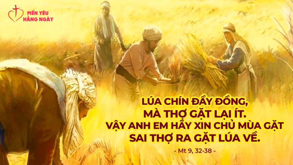 Đức Giê-su thấy đám đông thì chạnh lòng thương, vì họ lầm than vất vưởng, như bầy chiên không người chăn dắt. Bấy giờ, Người nói với môn đệ rằng: Lúa chín đầy đồng, mà thợ gặt lại ít. Vậy anh em hãy xin chủ mùa gặt sai thợ ra gặt lúa về.”