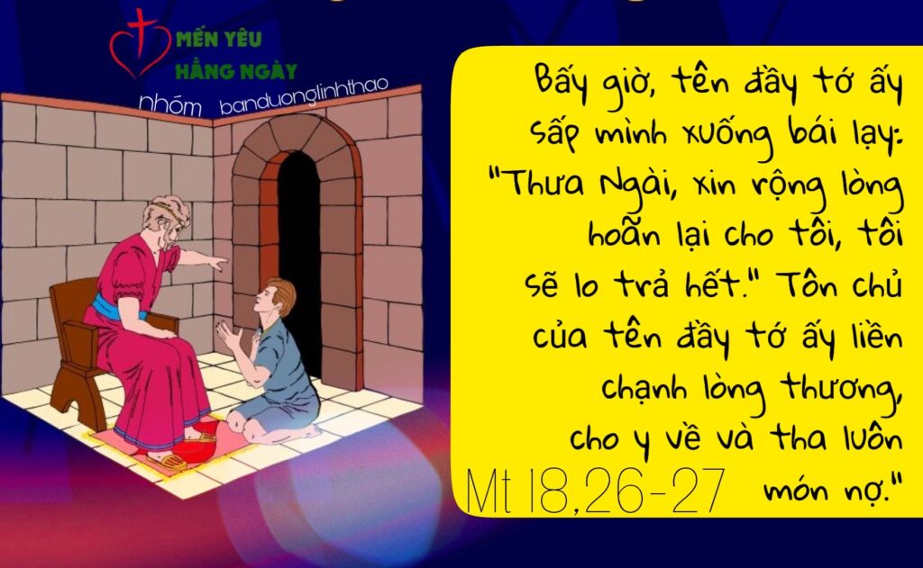 “Bấy giờ, tên đầy tớ ấy sấp mình xuống bái lạy: “Thưa Ngài, xin rộng lòng hoãn lại cho tôi, tôi sẽ lo trả hết.” Tôn chủ của tên đầy tớ ấy liền chạnh lòng thương, cho y về và tha luôn món nợ.” (Mt 18,26-27)