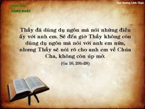 “Thầy đã dùng dụ ngôn mà nói những điều này với anh em. Sẽ đến giờ Thầy không còn dùng dụ ngôn mà nói với anh em nữa, nhưng Thầy sẽ nói rõ ràng cho anh em về Chúa Cha, không còn úp mở.” (Ga 16, 25)