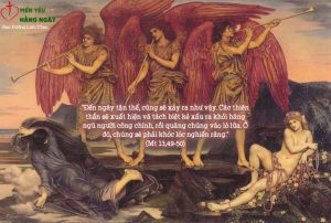 “Nước Trời lại còn giống như chuyện chiếc lưới thả xuống biển, gom được đủ thứ cá. Khi lưới đầy, người ta kéo lên bãi, rồi ngồi nhặt cá tốt cho vào giỏ, còn cá xấu thì vứt ra ngoài. Đến ngày tận thế, cũng sẽ xảy ra như vậy. Các thiên thần sẽ xuất hiện và tách biệt kẻ xấu ra khỏi hàng ngũ người công chính, rồi quăng chúng vào lò lửa. Ở đó, chúng sẽ phải khóc lóc nghiến răng.