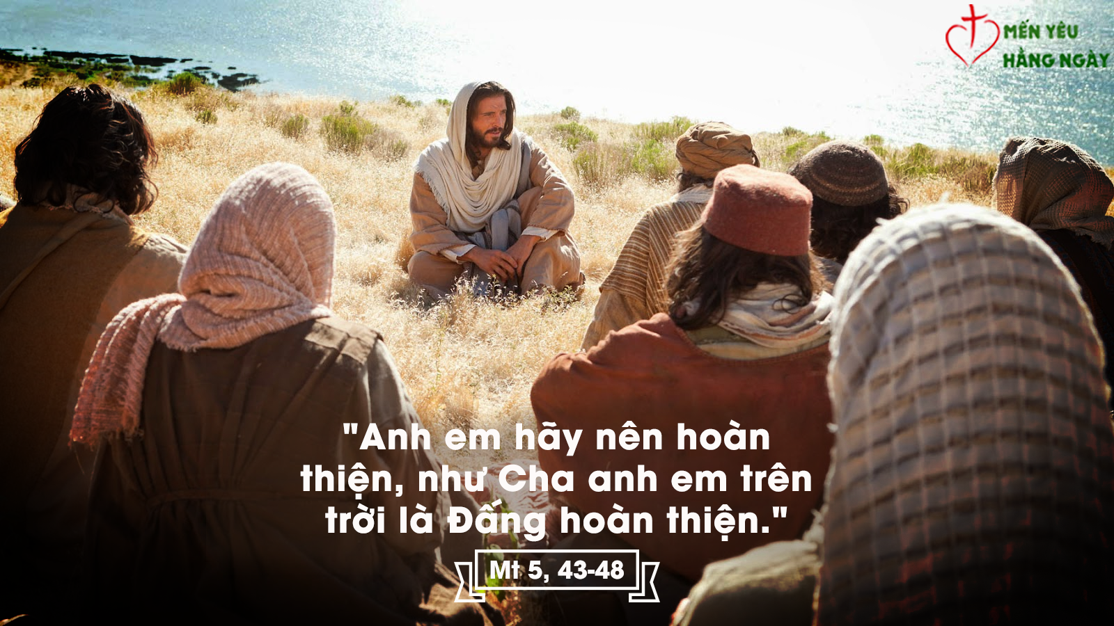 “Anh em đã nghe Luật dạy rằng: Hãy yêu đồng loại và hãy ghét kẻ thù. Còn Thầy, Thầy bảo anh em: hãy yêu kẻ thù và cầu nguyện cho những kẻ ngược đãi anh em. Như vậy, anh em mới được trở nên con cái của Cha anh em, Đấng ngự trên trời, vì Người cho mặt trời của Người mọc lên soi sáng kẻ xấu cũng như người tốt, và cho mưa xuống trên người công chính cũng như kẻ bất chính. Vì nếu anh em yêu thương kẻ yêu thương mình, thì anh em nào có công chi? Ngay cả những người thu thuế cũng chẳng làm như thế sao? Nếu anh em chỉ chào hỏi anh em mình thôi, thì anh em có làm gì lạ thường đâu? Ngay cả người ngoại cũng chẳng làm như thế sao? Vậy anh em hãy nên hoàn thiện, như Cha anh em trên trời là Đấng hoàn thiện.”