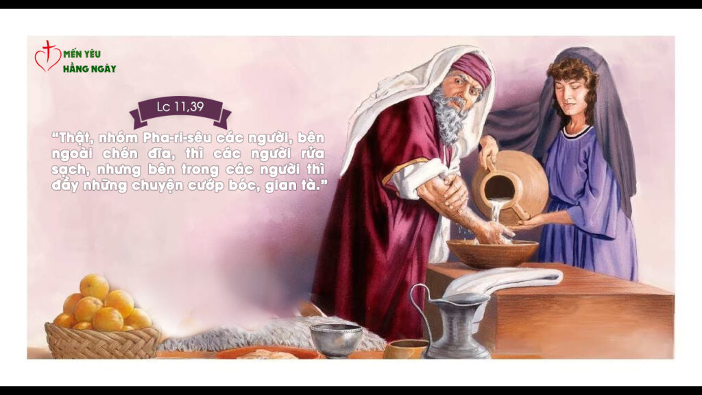 Đức Giê-su đang nói, thì có một ông Pha-ri-sêu mời Người đến nhà dùng bữa. Tới nơi, Người liền vào bàn ăn. Thấy vậy, ông Pha-ri-sêu lấy làm lạ vì Người không rửa tay trước bữa ăn. Nhưng Chúa nói với ông ấy rằng: “Thật, nhóm Pha-ri-sêu các người, bên ngoài chén đĩa, thì các người rửa sạch, nhưng bên trong các người thì đầy những chuyện cướp bóc, gian tà. Đồ ngốc! Đấng làm ra cái bên ngoài lại đã không làm ra cái bên trong sao? Tốt hơn, hãy bố thí những gì ở bên trong, thì bấy giờ mọi sự sẽ trở nên trong sạch cho các người.