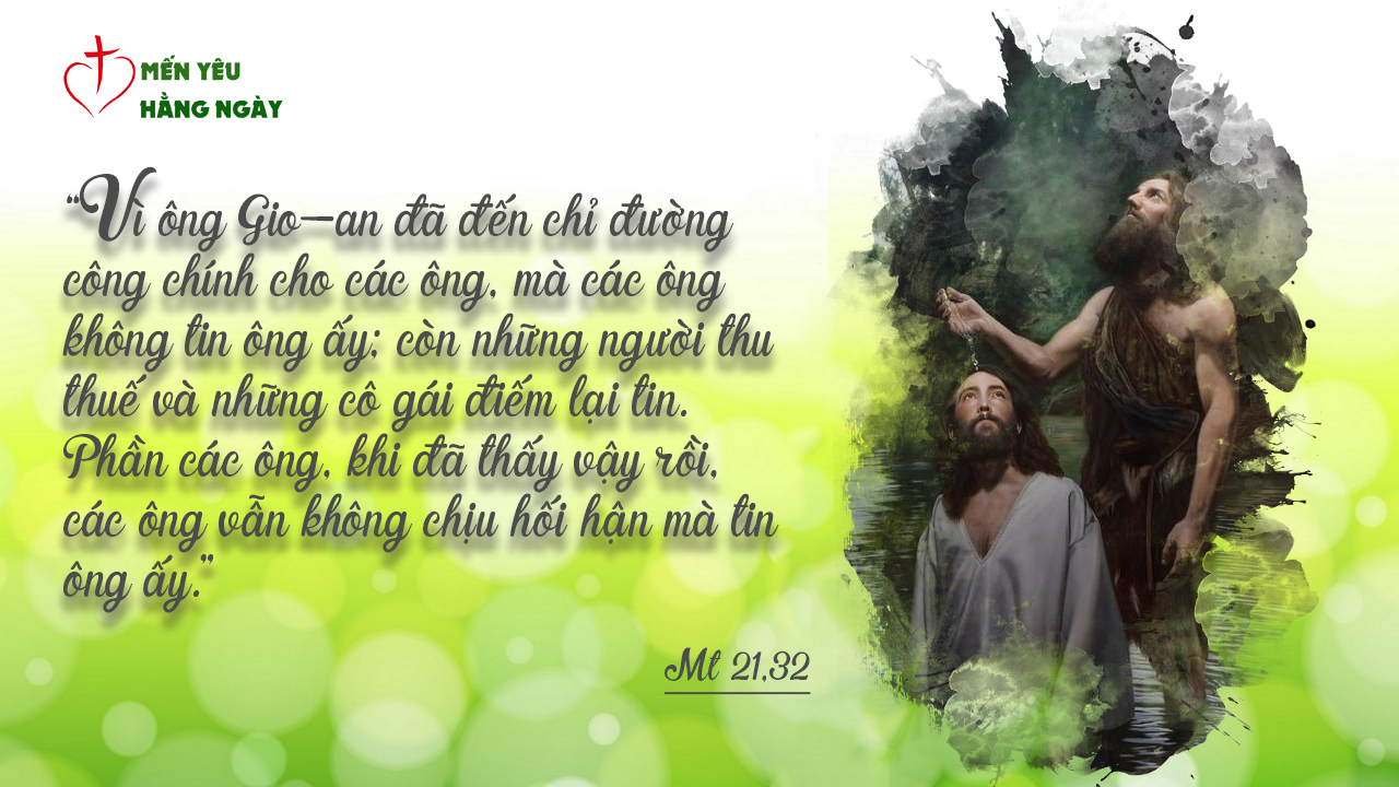 Các ông nghĩ sao: Một người kia có hai con trai. Ông ta đến nói với người thứ nhất: “Này con, hôm nay con hãy đi làm vườn nho.” Nó đáp: “Con không muốn đâu!” Nhưng sau đó, nó hối hận, nên lại đi. Ông đến gặp người thứ hai, và cũng bảo như vậy. Nó đáp: “Thưa ngài, con đây!” nhưng rồi lại không đi. Trong hai người con đó, ai đã thi hành ý muốn của người cha?” Họ trả lời: “Người thứ nhất.” Đức Giê-su nói với họ: “Tôi bảo thật các ông: những người thu thuế và những cô gái điếm vào Nước Thiên Chúa trước các ông. Vì ông Gio-an đã đến chỉ đường công chính cho các ông, mà các ông không tin ông ấy; còn những người thu thuế và những cô gái điếm lại tin. Phần các ông, khi đã thấy vậy rồi, các ông vẫn không chịu hối hận mà tin ông ấy.”