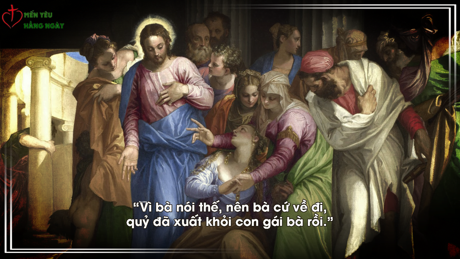 Đức Giê-su đứng dậy, rời nơi đó, đến địa hạt Tia. Người vào một nhà nọ mà không muốn cho ai biết, nhưng không thể giấu được. Thật vậy, một người đàn bà có đứa con gái nhỏ bị quỷ ám, vừa nghe nói đến Người, liền vào sấp mình dưới chân Người. Bà là người Hy-lạp, gốc Phê-ni-xi thuộc xứ Xy-ri. Bà xin Người trừ quỷ cho con gái bà. Người nói với bà: “Phải để cho con cái ăn no trước đã, vì không được lấy bánh dành cho con cái mà ném cho chó con.” Bà ấy đáp: “Thưa Ngài, đúng thế, nhưng chó con ở dưới gầm bàn lại được ăn những mảnh vụn của đám trẻ con.” Người nói với bà: “Vì bà nói thế, nên bà cứ về đi, quỷ đã xuất khỏi con gái bà rồi.” Về đến nhà, bà thấy đứa trẻ nằm trên giường và quỷ đã xuất.”