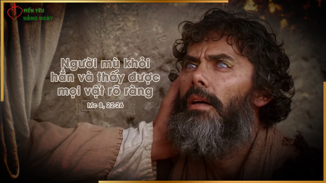 Đức Giê-su và các môn đệ đến Bết-xai-đa. Người ta dẫn một người mù đến và nài xin Đức Giê-su sờ vào anh ta. Người cầm lấy tay anh mù, đưa ra khỏi làng, rồi nhổ nước miếng vào mắt anh, đặt tay trên anh và hỏi: “Anh có thấy gì không?” Anh ngước mắt lên và thưa: “Tôi thấy người ta, trông họ như cây cối, họ đi đi lại lại.” Rồi Người lại đặt tay trên mắt anh, anh trông rõ và khỏi hẳn; anh thấy tỏ tường mọi sự. Người cho anh về nhà và dặn: “Anh đừng có vào làng.”