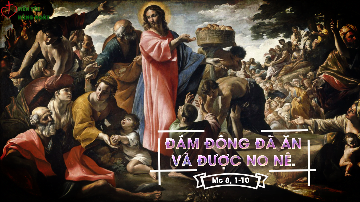 Trong những ngày ấy, lại có rất đông dân chúng, và họ không có gì ăn, nên Đức Giê-su gọi các môn đệ lại mà nói: “Thầy chạnh lòng thương đám đông, vì họ ở luôn với Thầy đã ba ngày rồi mà không có gì ăn! Nếu Thầy giải tán, để họ nhịn đói mà về nhà, thì họ sẽ bị xỉu dọc đường. Trong số đó, lại có những người ở xa đến. Các môn đệ thưa Người: “Ở đây, trong nơi hoang vắng này, lấy đâu ra bánh cho họ ăn no?” Người hỏi các ông: “Anh em có mấy chiếc bánh?” Các ông đáp: “Thưa có bảy chiếc.” Người truyền cho họ ngồi xuống đất. Rồi Người cầm lấy bảy chiếc bánh, dâng lời tạ ơn, và bẻ ra, trao cho các môn đệ để các ông dọn ra. Và các ông đã dọn ra cho đám đông. Các ông cũng có mấy con cá nhỏ. Người đọc lời chúc tụng, rồi bảo các ông dọn cả cá ra. Đám đông đã ăn và được no nê. Người ta nhặt lấy những mẩu bánh còn thừa: bảy giỏ! Mà đám đông có khoảng bốn ngàn người. Người giải tán họ. Lập tức, Đức Giê-su xuống thuyền với các môn đệ và đến miền Đan-ma-nu-tha.