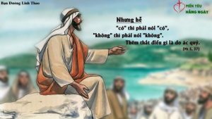 Tại sao Chúa Giêsu lại đưa ra những lời giảng dạy về điều này? Có những người hay có thói quen thề thốt trong các cuộc nói chuyện. Chữ “thề” đã đánh mất đi ý nghĩa long trọng nghiêm trang của nó và gần như chỉ còn là một từ đệm chẳng có giá trị gì. Lại cũng có những người dễ dàng hứa hẹn hoặc cam kết đủ điều, nhưng trong lòng lại không xem trọng, thậm chí là không có ý định giữ hoặc thực hiện điều ấy. Do vậy, điều Chúa Giêsu nói trong bài Tin Mừng hôm nay, Ngài nhắc nhớ chúng ta về ý nghĩa của điều răn thứ 8 – điều răn về sự trung thực từ trong suy nghĩ, lời nói đến việc làm.