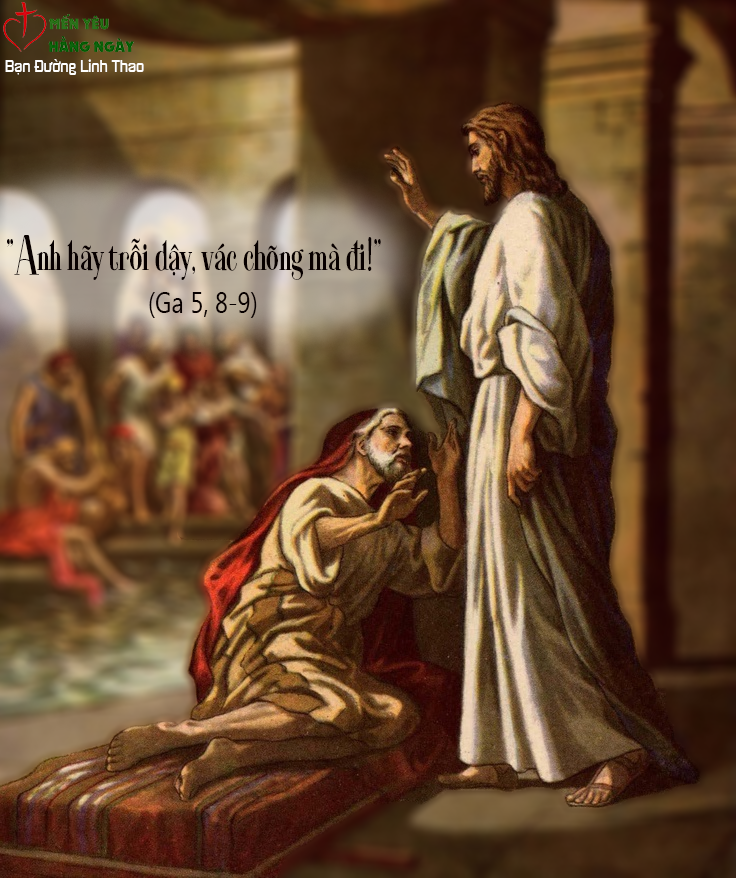 Hôm đó lại là ngày sa-bát. Người Do-thái mới nói với kẻ được khỏi bệnh: “Hôm nay là ngày sa-bát, anh không được phép vác chõng!” Nhưng anh đáp: “Chính người chữa tôi khỏi bệnh đã nói với tôi: ‘Anh hãy vác chõng mà đi!'” Họ hỏi anh: “Ai là người đã bảo anh: ‘Vác chõng mà đi’?” Nhưng người đã được khỏi bệnh không biết là ai. Quả thế, Đức Giê-su đã lánh đi, vì có đám đông ở đấy. Sau đó, Đức Giê-su gặp người ấy trong Đền Thờ và nói: “Này, anh đã được khỏi bệnh. Đừng phạm tội nữa, kẻo lại phải khốn hơn trước!” Anh ta đi nói với người Do-thái: Đức Giê-su là người đã chữa anh khỏi bệnh. Do đó, người Do-thái chống đối Đức Giê-su, vì Người hay chữa bệnh ngày sa-bát.