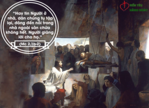 Sau khi Chúa Giê-su chữa lành cho một người mắc bệnh phong hủi, có lẽ Chúa Giê-su đã ẩn thân nghỉ ngơi vài ngày và hôm nay Người trở lại Ca-phác-na-um. “Hay tin Người ở nhà, dân chúng tụ tập lại, đông đến nỗi trong nhà ngoài sân chứa không hết. Người giảng lời cho họ.” (Mc 2,1-2)