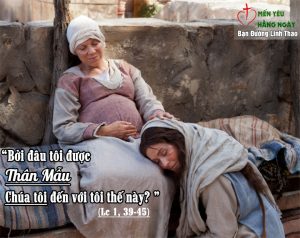 Hồi ấy, bà Ma-ri-a vội vã lên đường, đến miền núi, vào một thành thuộc chi tộc Giu-đa. Bà vào nhà ông Da-ca-ri-a và chào hỏi bà Ê-li-sa-bét. Bà Ê-li-sa-bét vừa nghe tiếng bà Ma-ri-a chào, thì đứa con trong bụng nhảy lên, và bà được đầy tràn Thánh Thần, liền kêu lớn tiếng và nói rằng: “Em được chúc phúc hơn mọi người phụ nữ, và người con em đang cưu mang cũng được chúc phúc. Bởi đâu tôi được Thân Mẫu Chúa tôi đến với tôi thế này? Vì này đây, tai tôi vừa nghe tiếng em chào, thì đứa con trong bụng đã nhảy lên vui sướng. Em thật có phúc, vì đã tin rằng Chúa sẽ thực hiện những gì Người đã nói với em.”
