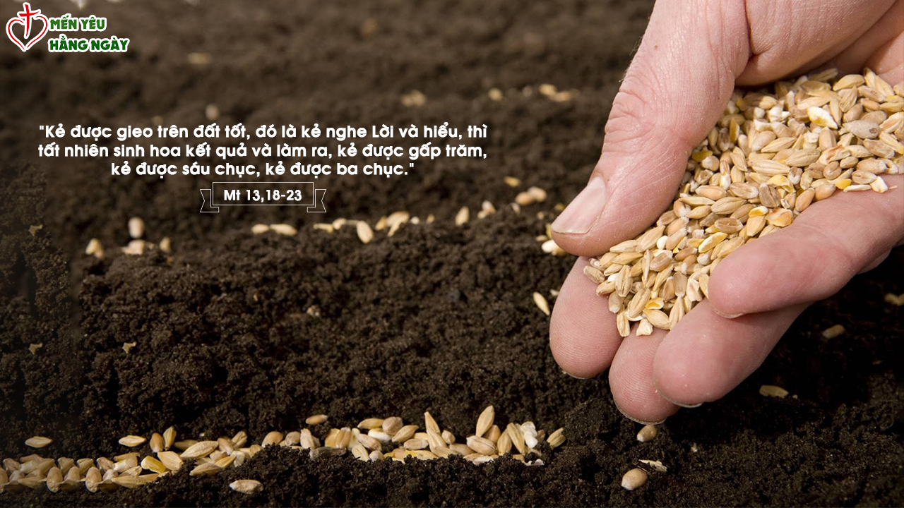 “Vậy anh em hãy nghe dụ ngôn người gieo giống. Hễ ai nghe lời rao giảng Nước Trời mà không hiểu, thì quỷ dữ đến cướp đi điều đã gieo trong lòng người ấy: đó là kẻ đã được gieo bên vệ đường. Còn kẻ được gieo trên nơi sỏi đá, đó là kẻ nghe Lời và liền vui vẻ đón nhận. Nhưng nó không đâm rễ mà là kẻ nhất thời: khi gặp gian nan hay bị ngược đãi vì Lời, nó vấp ngã ngay. Còn kẻ được gieo vào bụi gai, đó là kẻ nghe Lời, nhưng nỗi lo lắng sự đời, và bả vinh hoa phú quý bóp nghẹt, khiến Lời không sinh hoa kết quả gì. Còn kẻ được gieo trên đất tốt, đó là kẻ nghe Lời và hiểu, thì tất nhiên sinh hoa kết quả và làm ra, kẻ được gấp trăm, kẻ được sáu chục, kẻ được ba chục.”