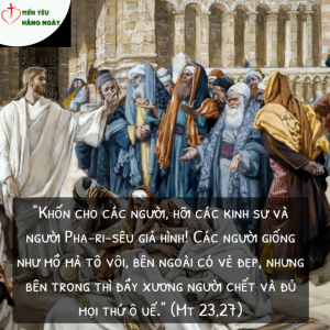 “Khốn cho các người, hỡi các kinh sư và người Pha-ri-sêu giả hình! Các người giống như mồ mả tô vôi, bên ngoài có vẻ đẹp, nhưng bên trong thì đầy xương người chết và đủ mọi thứ ô uế. Các người cũng vậy, bên ngoài thì có vẻ công chính trước mặt thiên hạ, nhưng bên trong toàn là giả hình và gian ác!