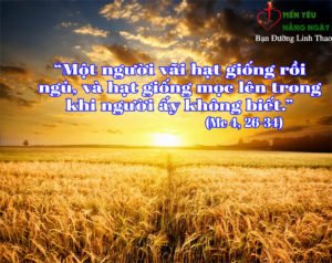 Người nói: “Chuyện Nước Thiên Chúa thì cũng tựa như chuyện một người vãi hạt giống xuống đất. Đêm hay ngày, người ấy có ngủ hay thức, thì hạt giống vẫn nẩy mầm và mọc lên, bằng cách nào, thì người ấy không biết. Đất tự động sinh ra hoa màu: trước hết cây lúa mọc lên, rồi trổ đòng đòng, và sau cùng thành bông lúa nặng trĩu hạt. Lúa vừa chín, người ấy đem liềm hái ra gặt, vì đã đến mùa.”