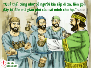 “Quả thế, cũng như có người kia sắp đi xa, liền gọi đầy tớ đến mà giao phó của cải mình cho họ. Ông cho người này năm yến, người kia hai yến, người khác nữa một yến, tuỳ khả năng riêng mỗi người. Rồi ông ra đi. Lập tức, người đã lãnh năm yến lấy số tiền ấy đi làm ăn buôn bán, và gây lời được năm yến khác. Cũng vậy, người đã lãnh hai yến gây lời được hai yến khác. Còn người đã lãnh một yến thì đi đào lỗ chôn giấu số bạc của chủ. Sau một thời gian lâu dài, ông chủ đến tính sổ với các đầy tớ và thanh toán sổ sách với họ. Người đã lãnh năm yến tiến lại gần, đưa năm yến khác, và nói: “Thưa ông chủ, ông đã giao cho tôi năm yến, tôi đã gây lời được năm yến khác đây.” Ông chủ nói với người ấy: “Khá lắm! hỡi đầy tớ tài giỏi và trung thành! Được giao ít mà anh đã trung thành, thì tôi sẽ giao nhiều cho anh. Hãy vào mà hưởng niềm vui của chủ anh!” Người đã lãnh hai yến cũng tiến lại gần và nói: “Thưa ông chủ, ông đã giao cho tôi hai yến, tôi đã gây lời được hai yến khác đây.” Ông chủ nói với người ấy: “Khá lắm! hỡi đầy tớ tài giỏi và trung thành! Được giao ít mà anh đã trung thành, thì tôi sẽ giao nhiều cho anh. Hãy vào mà hưởng niềm vui của chủ anh!” Rồi người đã lãnh một yến cũng tiến lại gần và nói: “Thưa ông chủ, tôi biết ông là người hà khắc, gặt chỗ không gieo, thu nơi không vãi. Vì thế, tôi đâm sợ, mới đem chôn giấu yến bạc của ông dưới đất. Của ông đây, ông cầm lấy!” Ông chủ đáp: “Hỡi đầy tớ tồi tệ và biếng nhác! Anh đã biết tôi gặt chỗ không gieo, thu nơi không vãi, thì đáng lý anh phải gởi số bạc của tôi vào ngân hàng, để khi tôi đến, tôi thu được cả vốn lẫn lời chứ! Vậy các ngươi hãy lấy yến bạc khỏi tay nó mà đưa cho người đã có mười yến. Vì phàm ai đã có, thì được cho thêm và sẽ có dư thừa; còn ai không có, thì ngay cái đang có, cũng sẽ bị lấy đi. Còn tên đầy tớ vô dụng kia, hãy quăng nó ra chỗ tối tăm bên ngoài: ở đó, sẽ phải khóc lóc nghiến răng.”