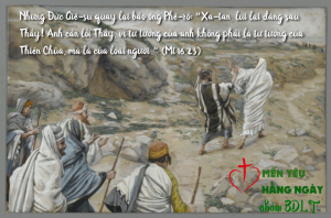 Từ lúc đó, Đức Giê-su Ki-tô bắt đầu tỏ cho các môn đệ biết: Người phải đi Giê-ru-sa-lem, phải chịu nhiều đau khổ do các kỳ mục, các thượng tế và kinh sư gây ra, rồi bị giết chết, và ngày thứ ba sẽ sống lại. Ông Phê-rô liền kéo riêng Người ra và bắt đầu trách Người: “Xin Thiên Chúa thương đừng để Thầy gặp phải chuyện ấy!” Nhưng Đức Giê-su quay lại bảo ông Phê-rô: “Xa-tan, lui lại đàng sau Thầy! Anh cản lối Thầy, vì tư tưởng của anh không phải là tư tưởng của Thiên Chúa, mà là của loài người.”