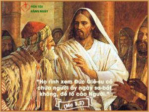 Đức Giê-su lại vào hội đường. Ở đó có một người bị bại tay. Họ rình xem Đức Giê-su có chữa người ấy ngày sa-bát không, để tố cáo Người. Đức Giê-su bảo người bại tay: “Anh trỗi dậy, ra giữa đây!” Rồi Người nói với họ: “Ngày sa-bát, được phép làm điều lành hay điều dữ, cứu mạng người hay giết đi?” Nhưng họ làm thinh. Đức Giê-su giận dữ rảo mắt nhìn họ, buồn khổ vì lòng họ chai đá. Người bảo anh bại tay: “Anh giơ tay ra!” Người ấy giơ ra, và tay liền trở lại bình thường. Ra khỏi đó, nhóm Pha-ri-sêu lập tức bàn tính với phe Hê-rô-đê, để tìm cách giết Đức Giê-su.