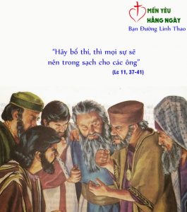 Đức Giê-su đang nói, thì có một ông Pha-ri-sêu mời Người đến nhà dùng bữa. Tới nơi, Người liền vào bàn ăn. Thấy vậy, ông Pha-ri-sêu lấy làm lạ vì Người không rửa tay trước bữa ăn. Nhưng Chúa nói với ông ấy rằng: “Thật, nhóm Pha-ri-sêu các người, bên ngoài chén đĩa, thì các người rửa sạch, nhưng bên trong các người thì đầy những chuyện cướp bóc, gian tà. Đồ ngốc! Đấng làm ra cái bên ngoài lại đã không làm ra cái bên trong sao? Tốt hơn, hãy bố thí những gì ở bên trong, thì bấy giờ mọi sự sẽ trở nên trong sạch cho các người.”