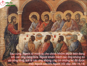 “Sau cùng, Người tỏ mình ra cho chính Nhóm Mười Một đang khi các ông dùng bữa. Người khiển trách các ông không tin và cứng lòng, bởi lẽ các ông không chịu tin những kẻ đã được thấy Người sau khi Người sống lại.” Mc (16,14)