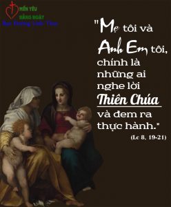 Mẹ và anh em Đức Giê-su đến gặp Người, mà không làm sao lại gần được, vì dân chúng quá đông. Người ta báo cho Người biết: “Thưa Thầy, có mẹ và anh em Thầy đang đứng ngoài kia, muốn gặp Thầy.” Người đáp lại: “Mẹ tôi và anh em tôi, chính là những ai nghe lời Thiên Chúa và đem ra thực hành.”