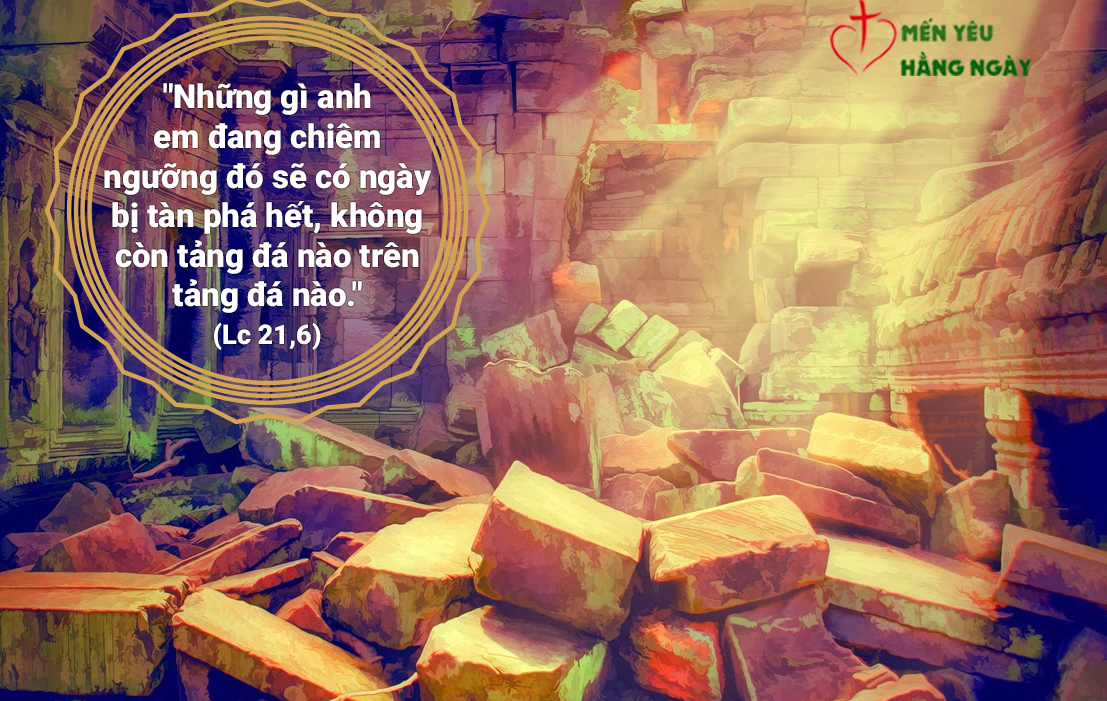 Nhân có mấy người nói về Đền Thờ được trang hoàng bằng những viên đá đẹp và những đồ dâng cúng, Đức Giê-su bảo: “Những gì anh em đang chiêm ngưỡng đó sẽ có ngày bị tàn phá hết, không còn tảng đá nào trên tảng đá nào.” Họ hỏi Người: “Thưa Thầy, vậy bao giờ các sự việc đó sẽ xảy ra, và khi sắp xảy ra, thì có điềm gì báo trước?”